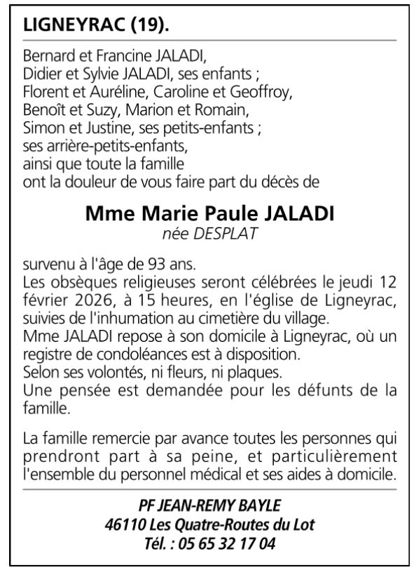 C’est avec une grande tristesse que nous vous annonçons le décès de Marie Paule JALADI survenu le dimanche 08 février 2026 à Ligneyrac. La cérémonie se déroulera le jeudi 12 février 2026 à 15h00 à l’adresse suivante : Eglise Saint-Cyr et Sainte-Julitte - Le Bourg - 19500 Ligneyrac.